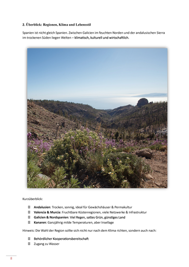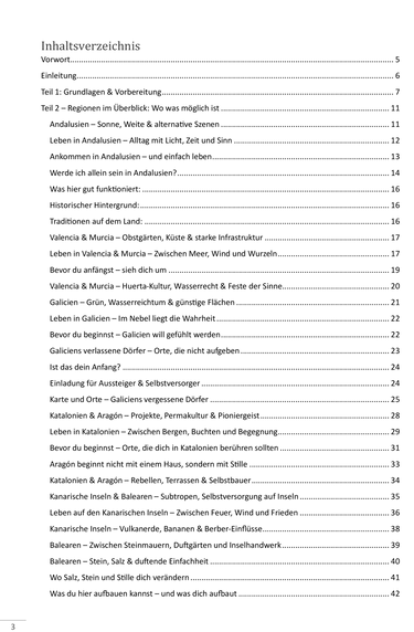 Lerne die Besonderheiten der Regionen kennen – von Andalusiens Weite über die stillen Dörfer Galiciens bis hin zu den Balearen und Kanarischen Inseln mit ihren ganz eigenen Rhythmen. Finde heraus, wo dein Projekt wachsen kann – und wie du selbst daran wächst. Mit praktischen Tipps, echten Erfahrungen, inspirierenden Texten und vielen Beispielen zum Leben, Arbeiten und Teilen in Spanien.