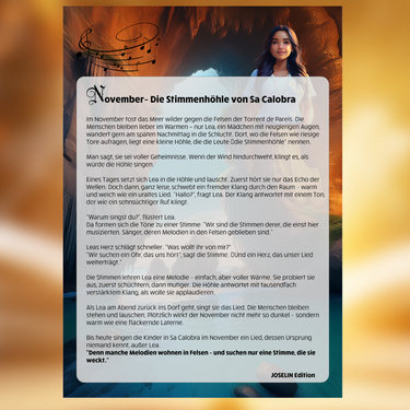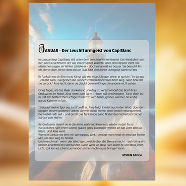 Der Märchenkalender Mallorca 2026 ist ein einzigartiger 13-Blatt-Wandkalender, der jeden Monat mit einem neuen, fantastisch illustrierten Inselmärchen verzaubert. Vom Leuchtturmgeist von Cap Blanc über die Blütenkönigin von Santa Maria bis hin zur Sternenkrippe von Betlem – jede Seite erzählt ein vollständiges Märchen aus dem hochwertigen VitoLibro-Projekt „12 Märchen Mallorca 2026“