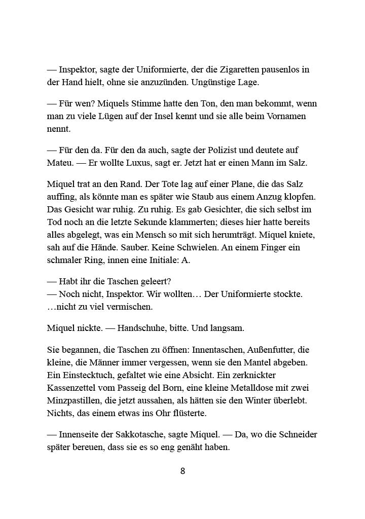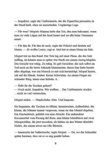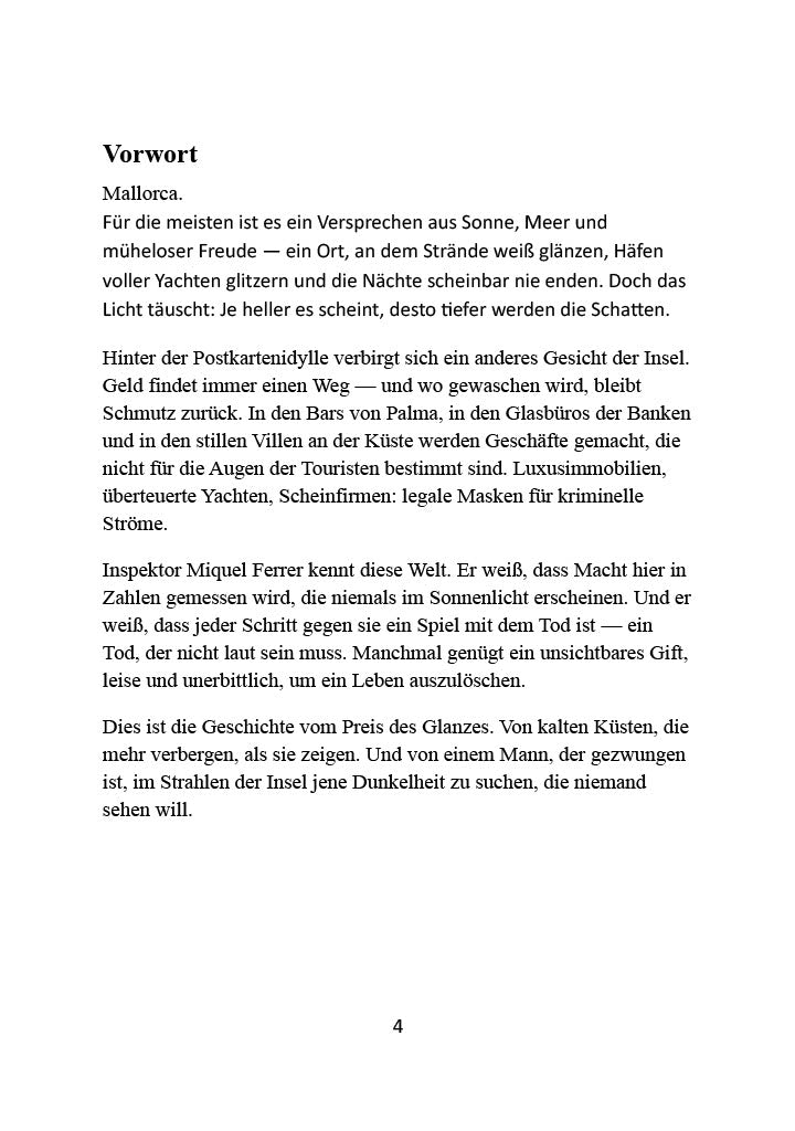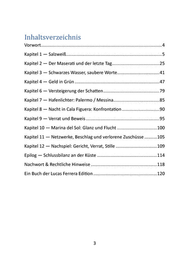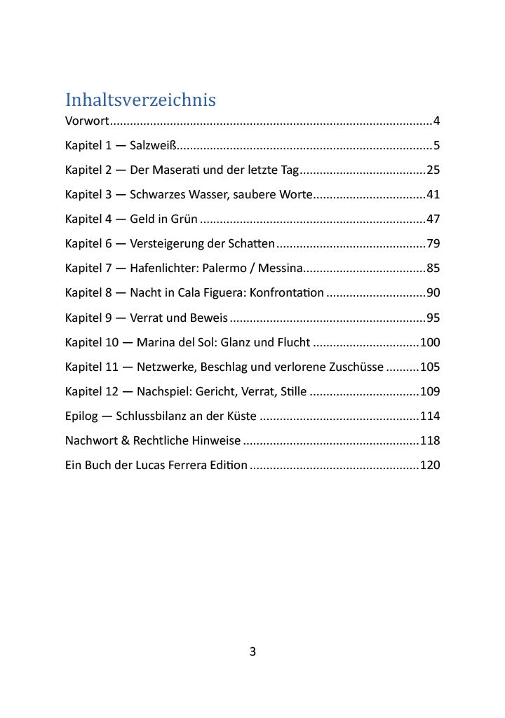 Ein Compliance-Officer wird tot in den Salinen gefunden, und Inspector Miquel Ferrer folgt einer Spur, die von Palmas Altstadt bis zu den exklusiven Kais der Yachten reicht. Maseratis, manipulierte Öko-Projekte und USB-Sticks voller Rechnungen – alles scheint sauber, doch nichts ist echt.